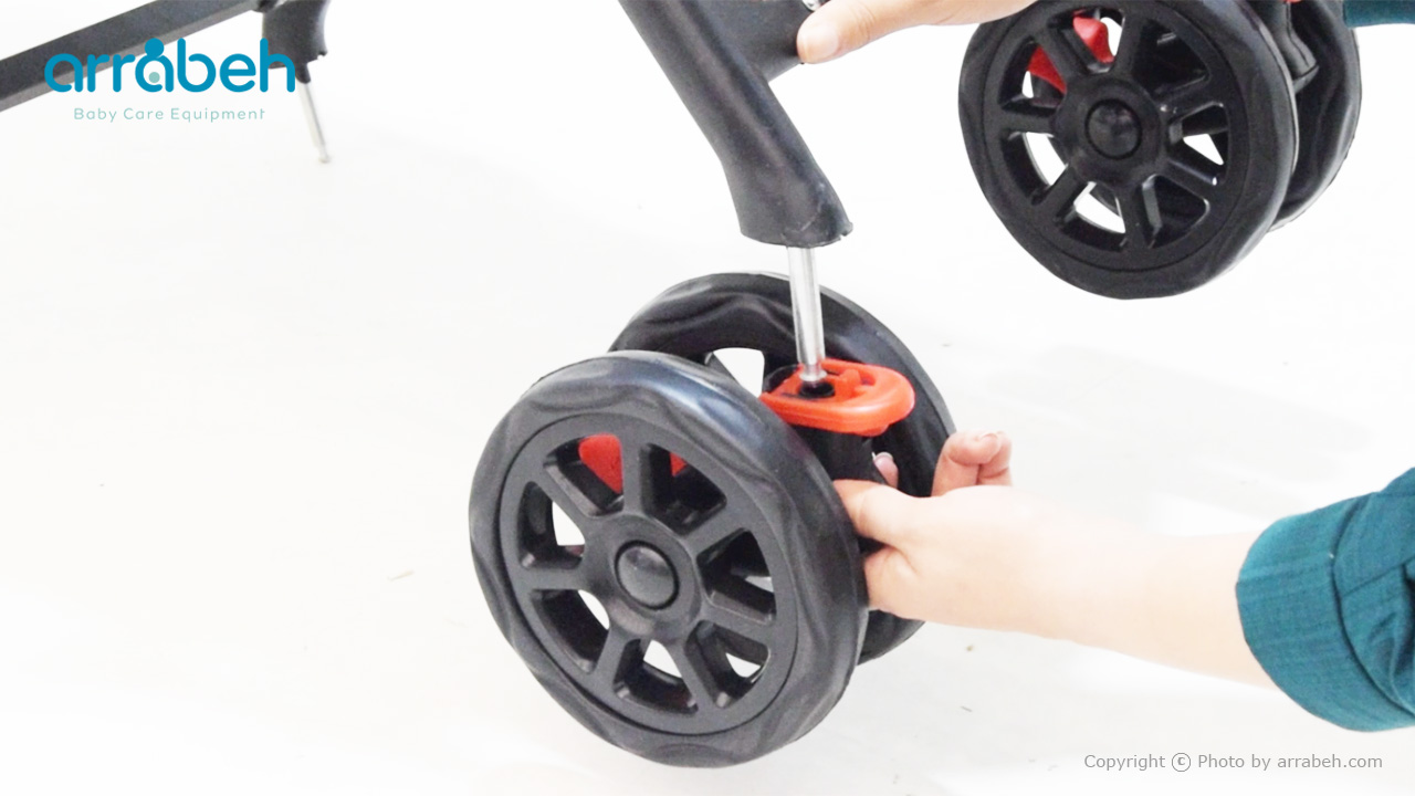 حالا نوبت به نصب چرخ‌ها می‌رسد. چرخ‌های جلو و عقب را از بسته‌بندی خارج کرده و هر کدام را در جای مخصوص خود قرار دهید. چرخ‌ها را به محورهای فلزی فشار دهید تا صدای “کلیک” را بشنوید. این صدا نشان‌دهنده این است که چرخ‌ها به درستی در جای خود قفل شده‌اند.