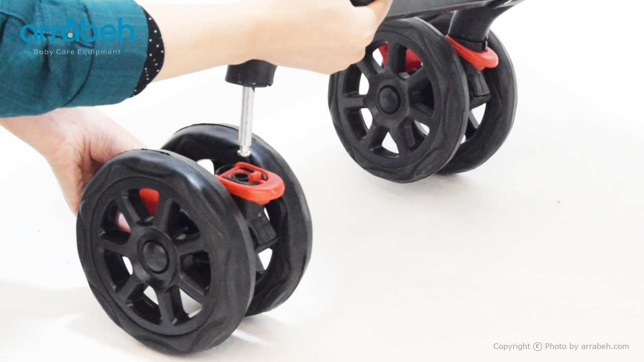 کالسکه مدل 151 دارای قابلیت چرخش 360 درجه برای چرخ‌های جلو و عقب است. برای فعال کردن این ویژگی، کافیست ضامن گردان قرمز رنگی که روی چرخ‌ها قرار دارد را به سمت بالا (باز شدن) و پایین (بسته شدن) فشار دهید. با این کار، کالسکه به راحتی در فضاهای کوچک حرکت می‌کند و مانور دادن با آن بسیار آسان می‌شود.