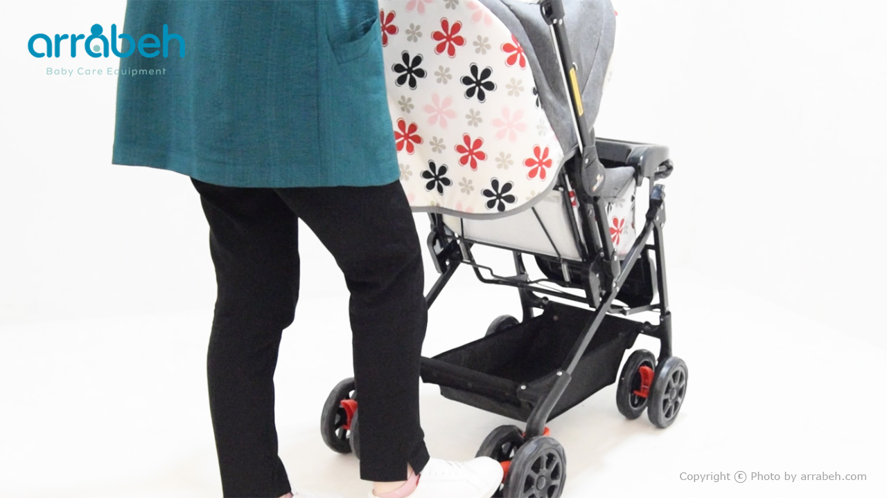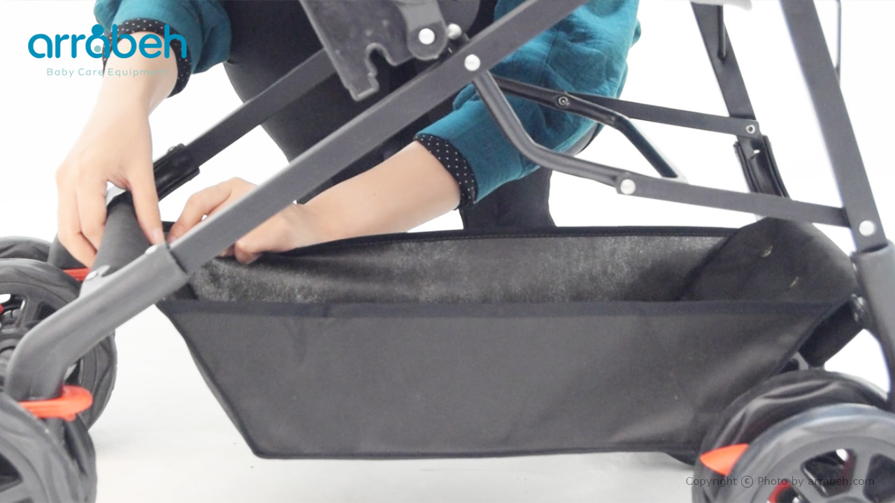 سبد زیرین کالسکه فضای مناسبی برای نگهداری وسایل کودک یا خرید‌های روزانه شما فراهم می‌کند. برای نصب آن، سبد را به آرامی روی فریم پایه های کالسکه قرار دهید و با استفاده از دکمه یا چسب قرار گرفته روی سبد، آن را به پایه ها محکم کنید تا از افتادن وسایل جلوگیری شود.